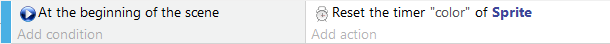 Tenga en cuenta que al igual que con los temporizadores de escenas, los nombres de los temporizadores de objetos son expresiones de cadena / texto. // ¡Deben ser escritos entre comillas! .// La acción anterior creará un temporizador llamado "color "en cada instancia del objeto Sprite e iniciará estos temporizadores.