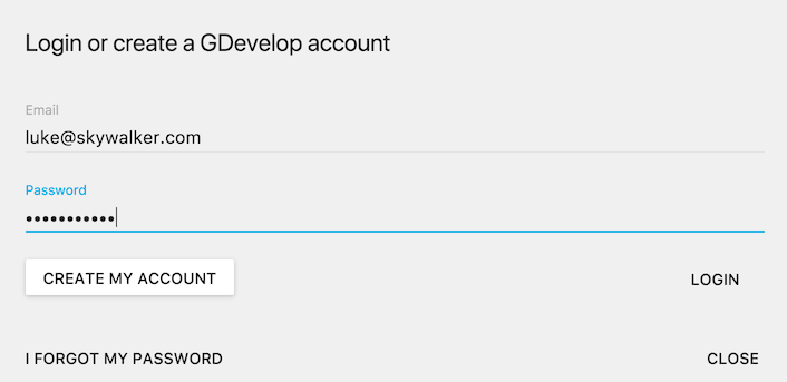 Un compte GDevelop est nécessaire pour quelques fonctionnalités, notamment l'exportation en un clic de votre jeu pour Android, iOS, Windows, macOS and Linux..