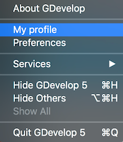 Si vous n'avez pas de compte, créez-en un gratuitement: dans le menu Fichier (sur Windows et Linux) ou dans le menu GDevelop (sur macOS), choisissez Mon profil: