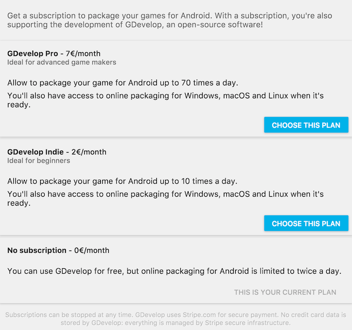 En obtenant un abonnement, vous débloquerez plus de packagings (et à l'avenir, plus de packagings en un clic pour iOS, Windows, MacOS et Linux! Vous soutiendrez également GDevelop pour le développement futur. ✨