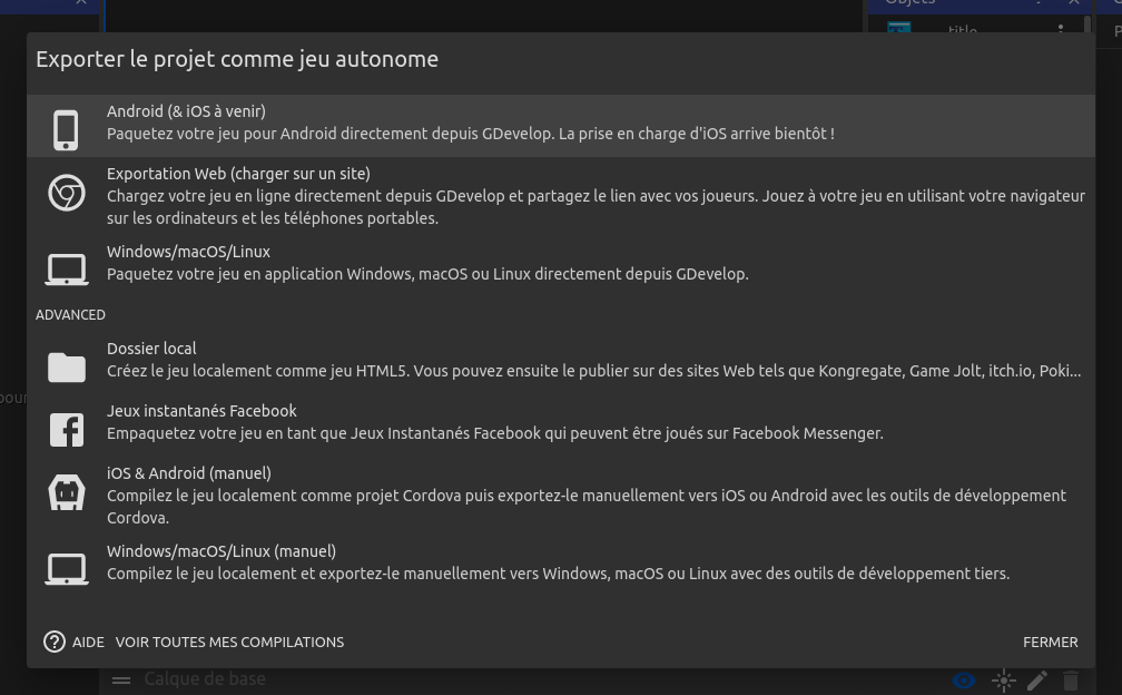 Publier votre jeu sur Android ou iOS GDevelop permet de publier vos jeux sur plein de platformes différentes, y compris Android et iOS avec les services d'empaquetage ou manuellement. Pour exporter un jeu, cliquez/sélectionnez 'Fichier" depuis le menu qui se trouve en haut de l'interface GDevelop. Choisissez l'option d'export que vous voulez. Dans ce cas, nous allons choisir Android et iOS depuis le panneau des options d'export.