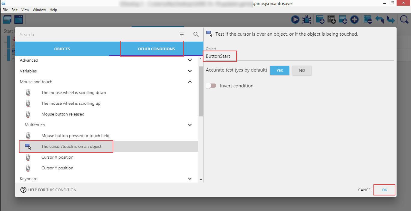 Dans le panneau OTHER CONDITIONS, sélectionnnez The cursor/touch is on an object entrez ButtonStart.