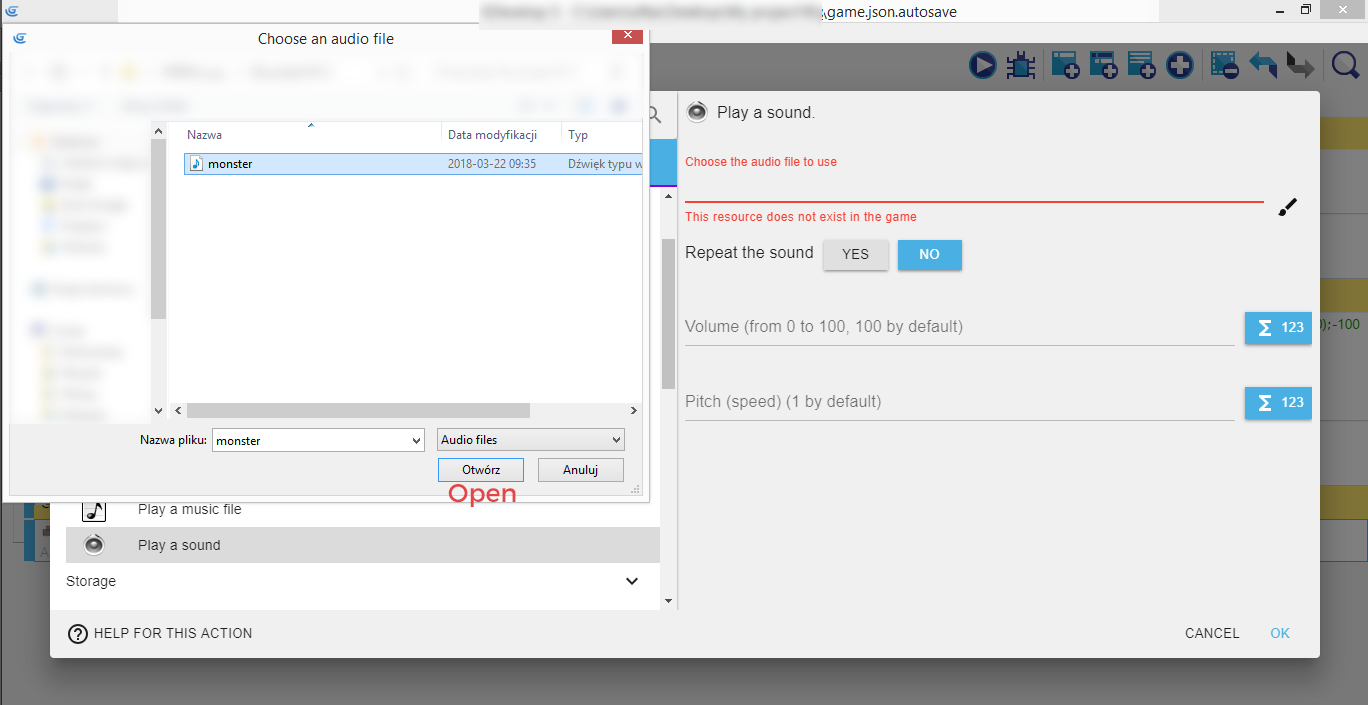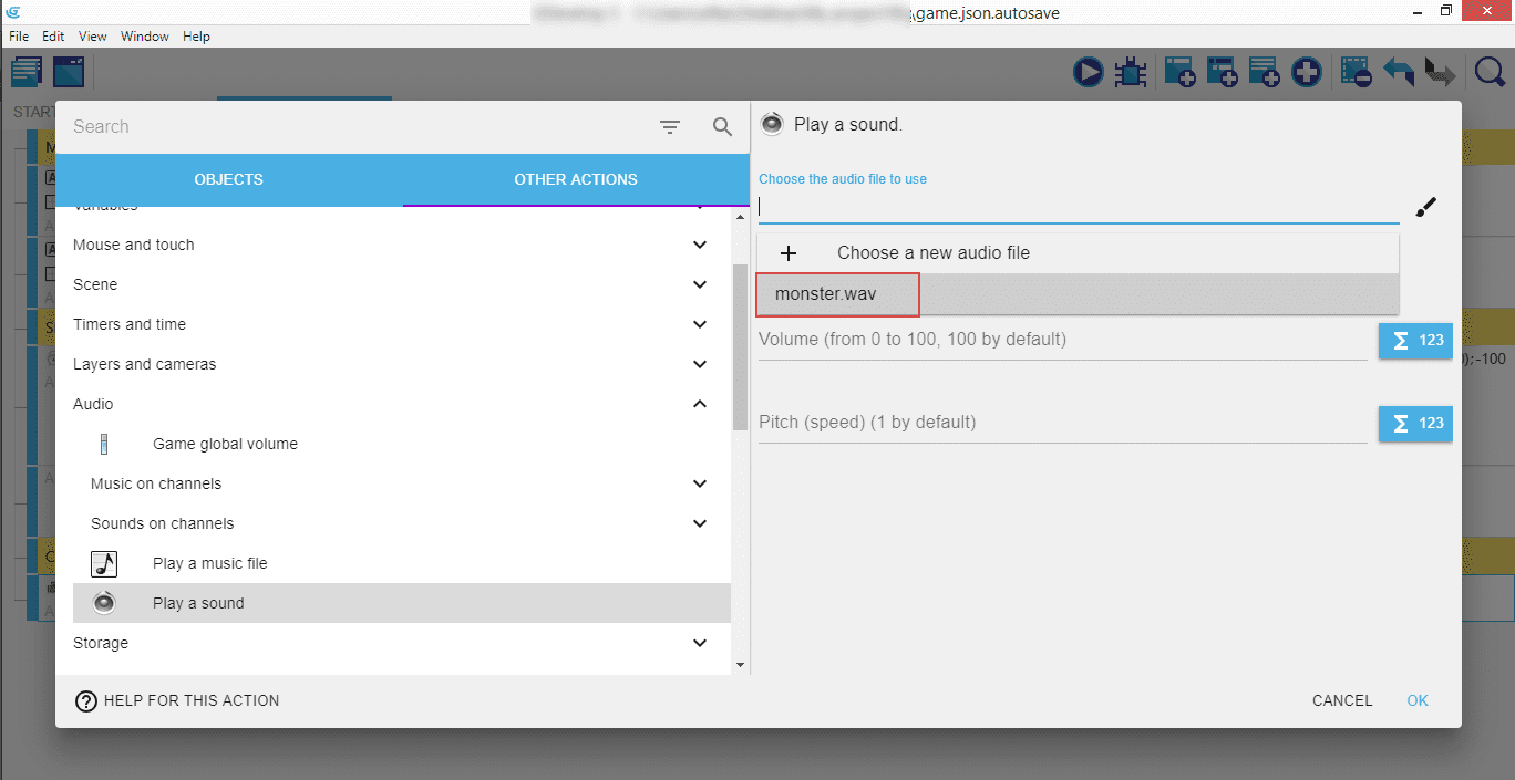 Cette action ouvre une fenêtre contextuelle où vous pourrez choisir et charger un fichier audio qui sera joué lorsque une forme est collectée par le monstre. Pour nous, il s'agit du fichier monster.wav.