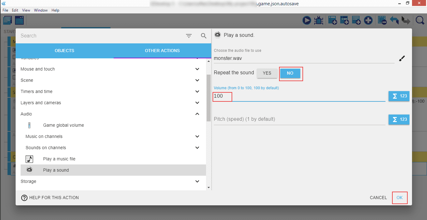 Assurez-vous que Repeat the sound (Répéter le son) est réglé sur NO car nous voulons que le son ne soit joué qu'une seule fois lorsque le monstre récupère la forme. Le volume par défaut est 100.