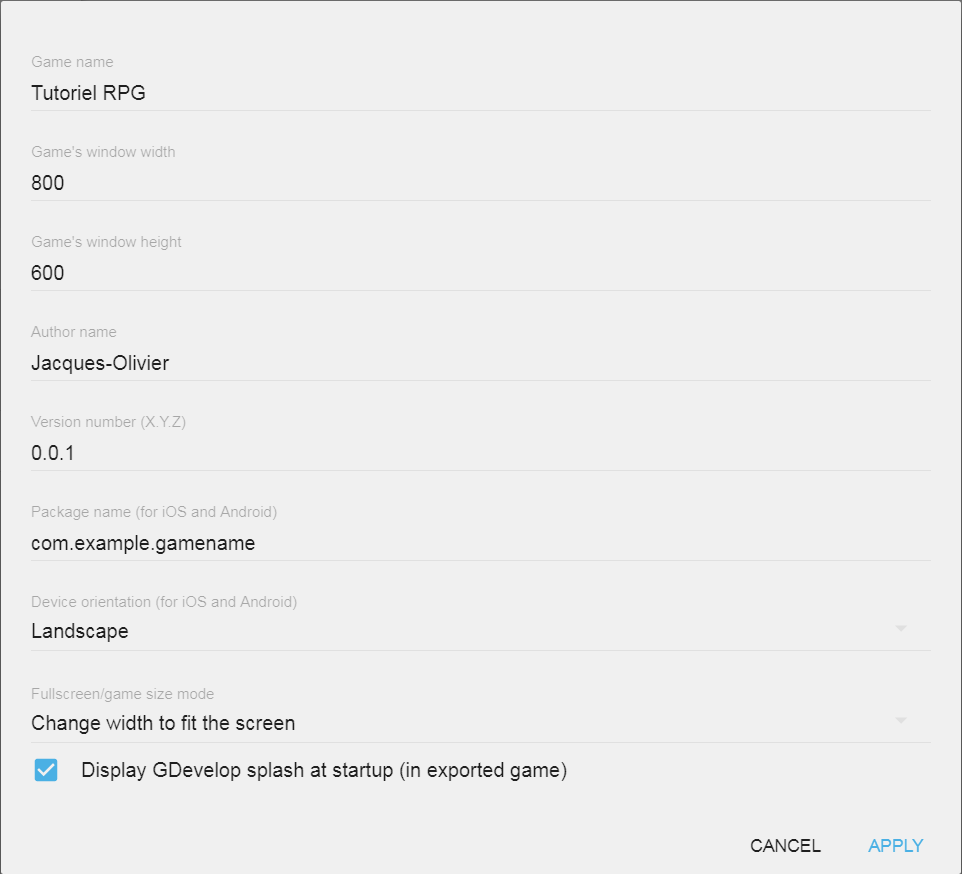 Dans votre onglet Project, sélectionnez Game Settings, puis Properties. Remplissez ensuite les champs comme ci-dessous. La taille de la largeur et de la longueur du jeu exprimée en pixels sera la taille de la fenêtre du jeu.