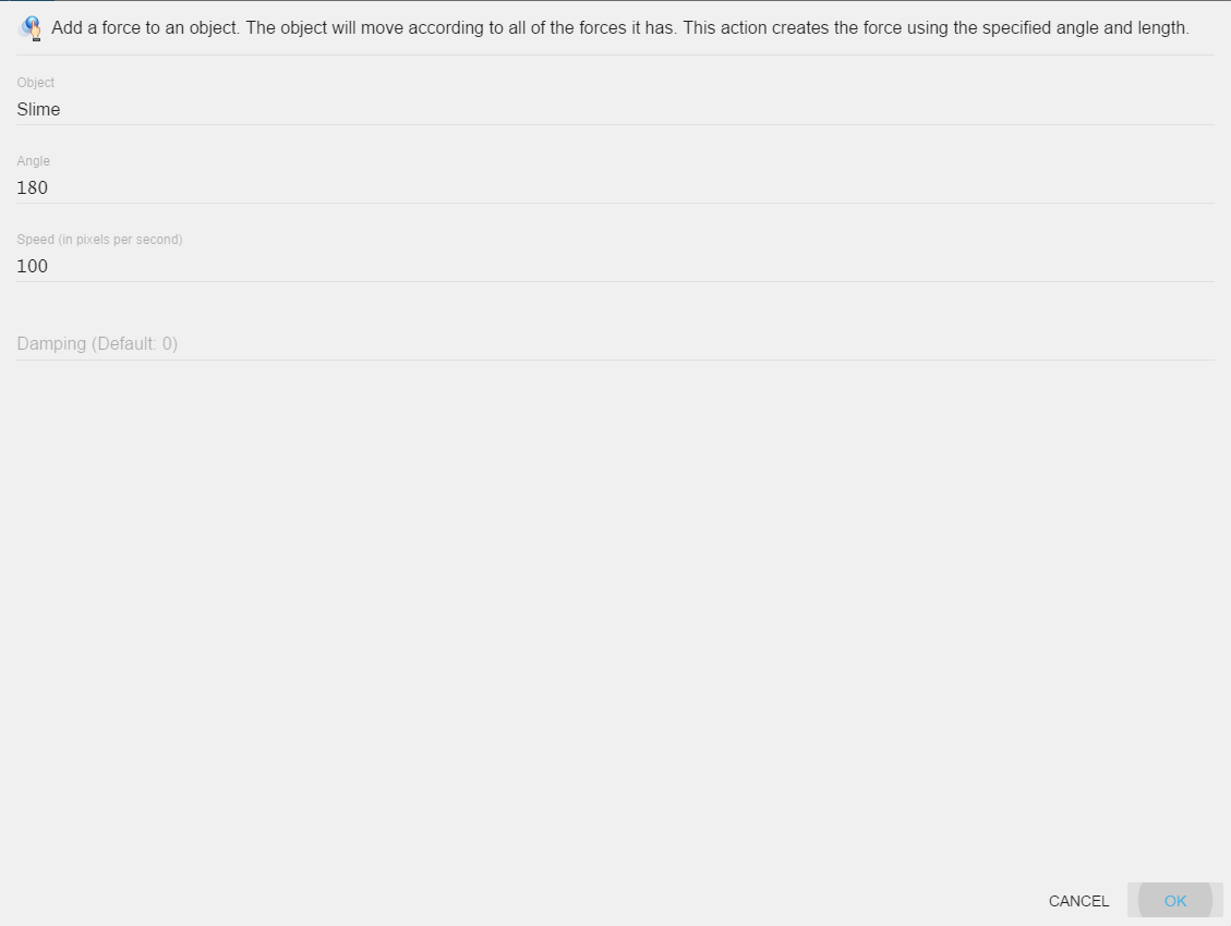 Cliquez Add action dans la condition qui vient d'être créée. Sélectionnez Common action for all objects > Movement > Add a force (angle) dans la liste de gauche. Sélectionnez Slime dans le champ Object, mettez Angle à 0 et Speed (in pixels per second) à 100, puis cliquez OK pour confirmer.