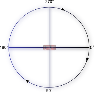 La figure ci-dessous, qui représente le système de coordonnées utilisé par GDevelop, montre que le déplacement vers la droite correspond bien à un angle de 0°.
