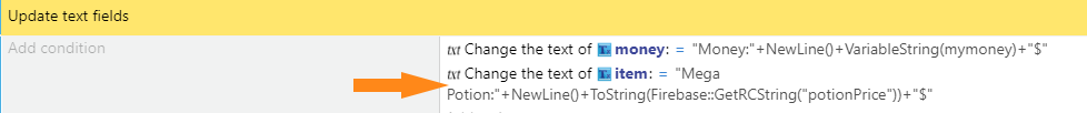 In our example, there was a static text showing how much money you lose by buying "potions". Now you can update that text to show the correct value: