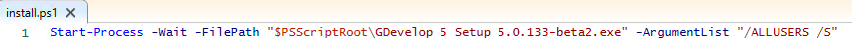 Start-Process -Wait -FilePath "$PSScriptRoot\GDevelop 5 Setup 5.X.XXX.exe" -ArgumentList "/ALLUSERS /S"