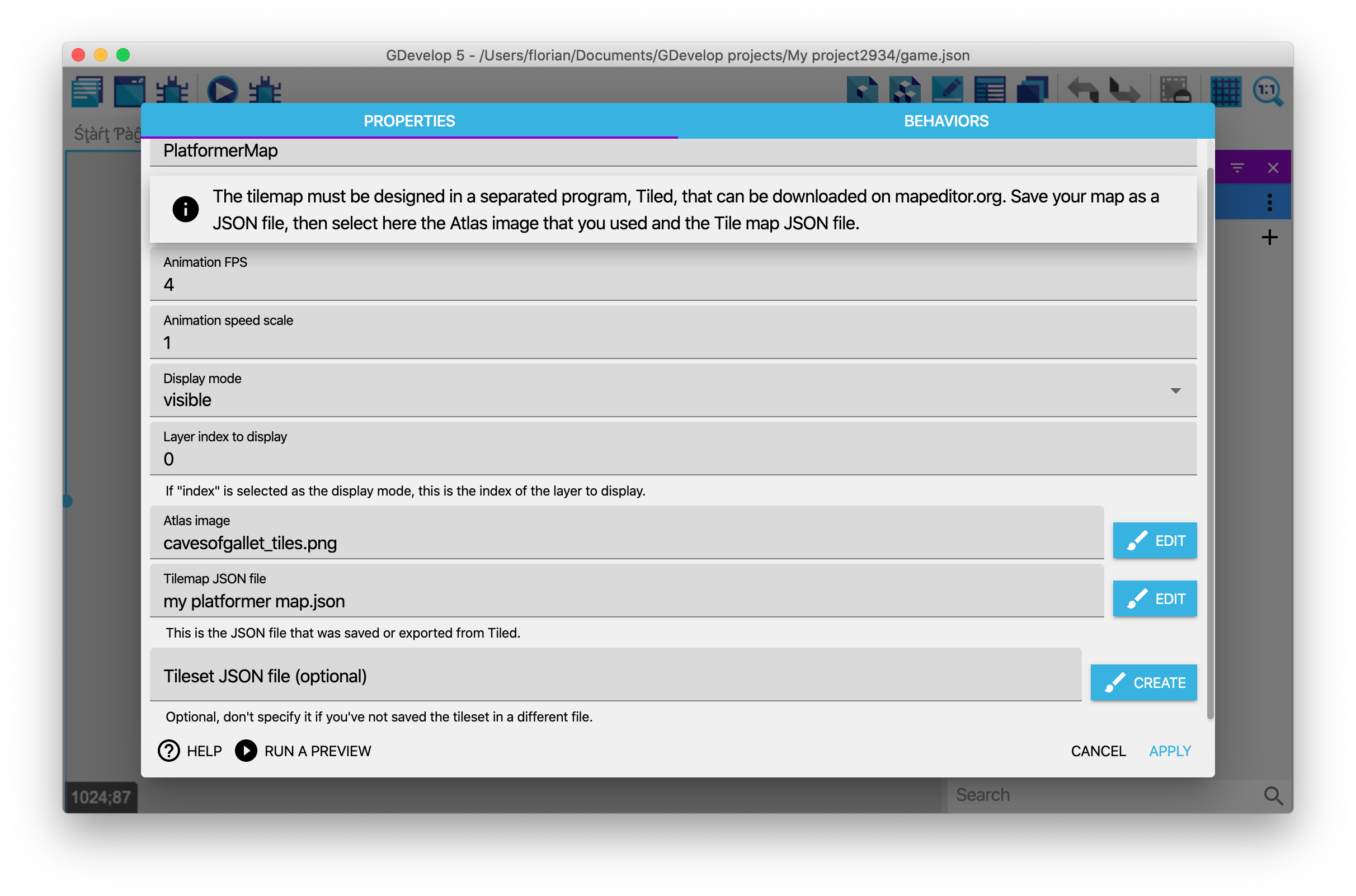 Finally, choose the tileset file in GDevelop, in addition to choosing the atlas image and the tilemap JSON file: