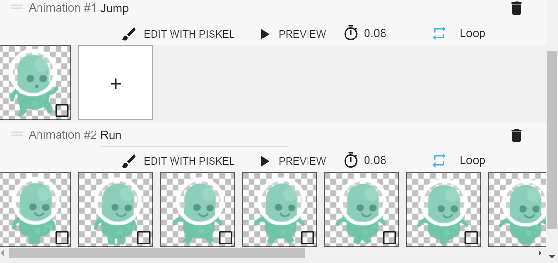 Our first animation is done. Now, let's add the Jumping and Running animations. Try doing it using the images provided in the archive that you've downloaded. There will be multiple frames for the Running animation, while the Jumping animation will only have one frame according to the archived file provided. After you are done with all three animations, it will look somewhat like this.