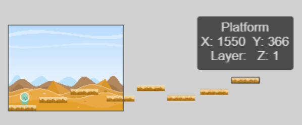 We need to create some more Obstacles/Platforms towards the right of the scene space for smoother random generation of obstacles. Lastly, we add a Skybox or background for our game. It is a Sprite type object. Try adding this object on your own. The asset being used here is background.png. The scene now looks like this. Notice the additional obstacles created. To put the background image behind all the other assets, we want it's Z-Order to be minimum. Z-Order can be changed in the Properties tab on the left.