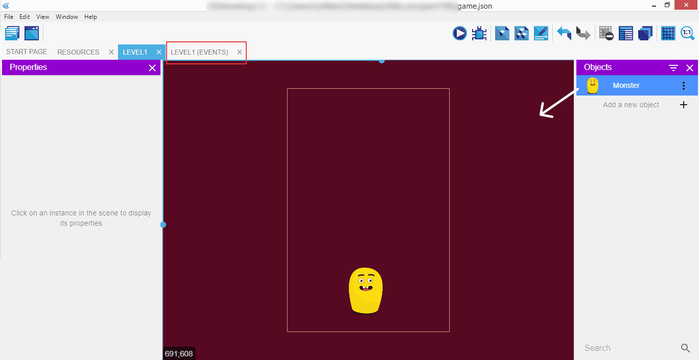 Drag the Monster from the right panel containing the objects onto the scene and click on the "Level1 (Events)" tab.