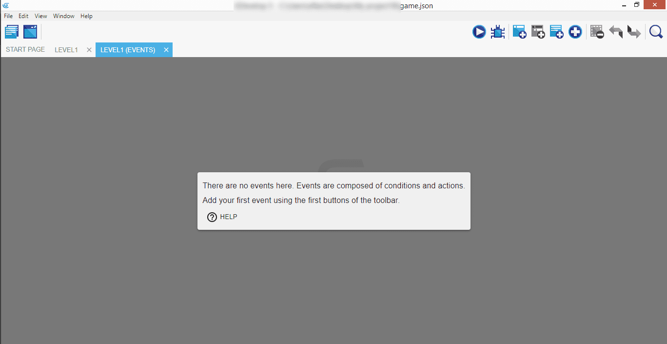 The events list is empty at the beginning - the popup message explains that events are composed of conditions and actions.