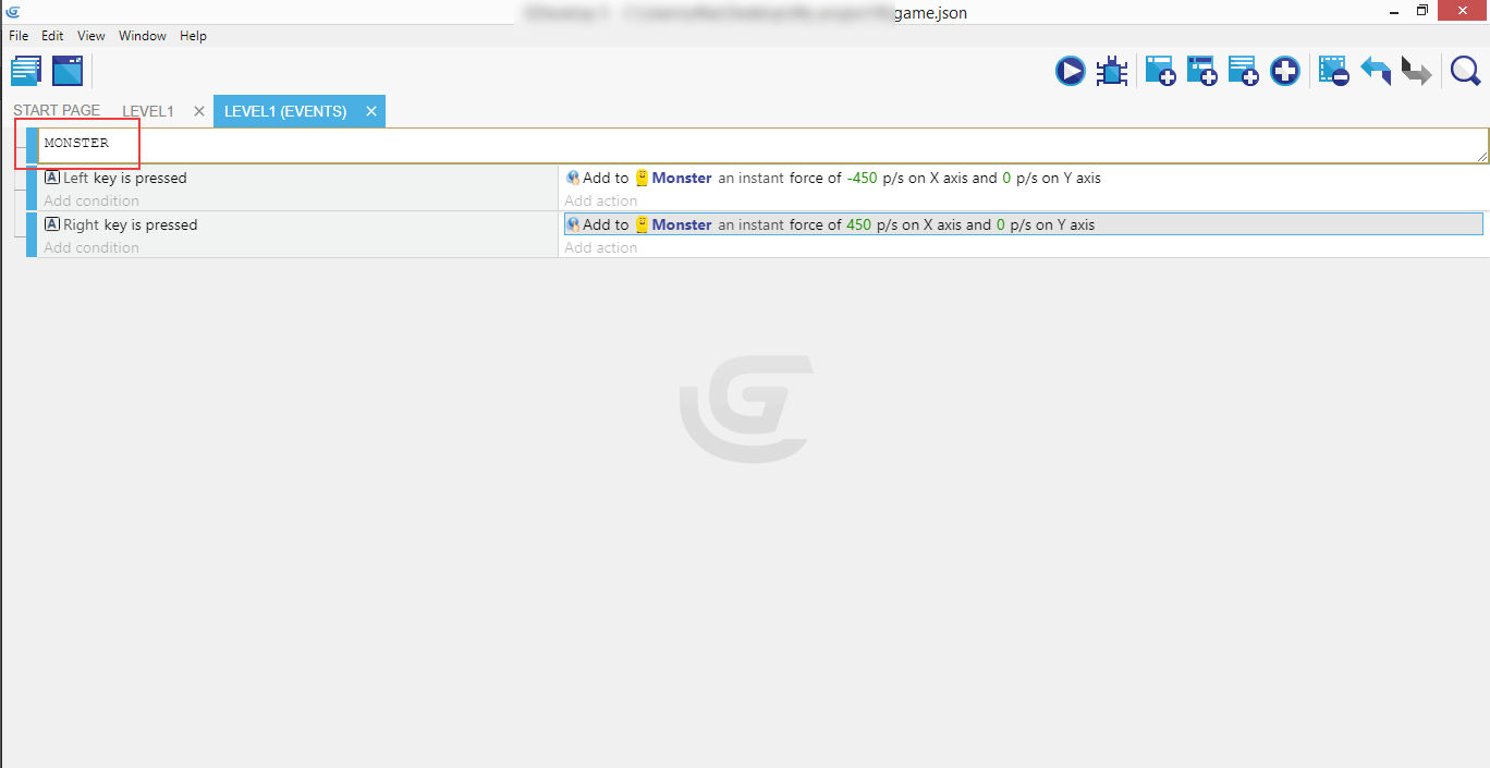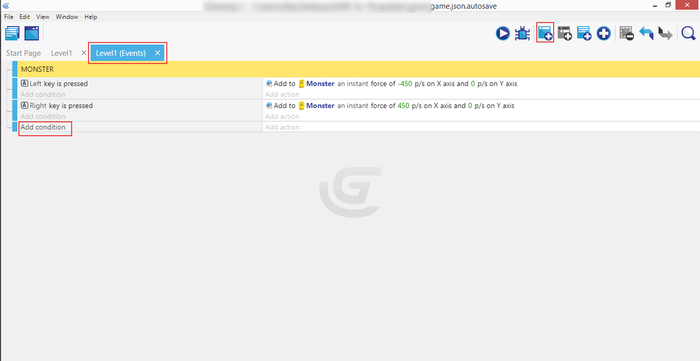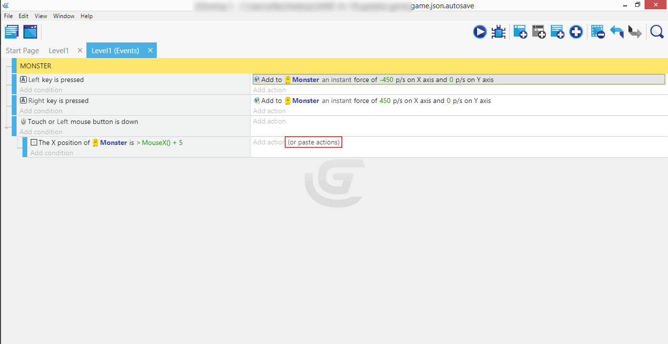 If you completed the right movement, both events with their conditions and actions should now be in place, so the Monster can move in either direction - left or right.