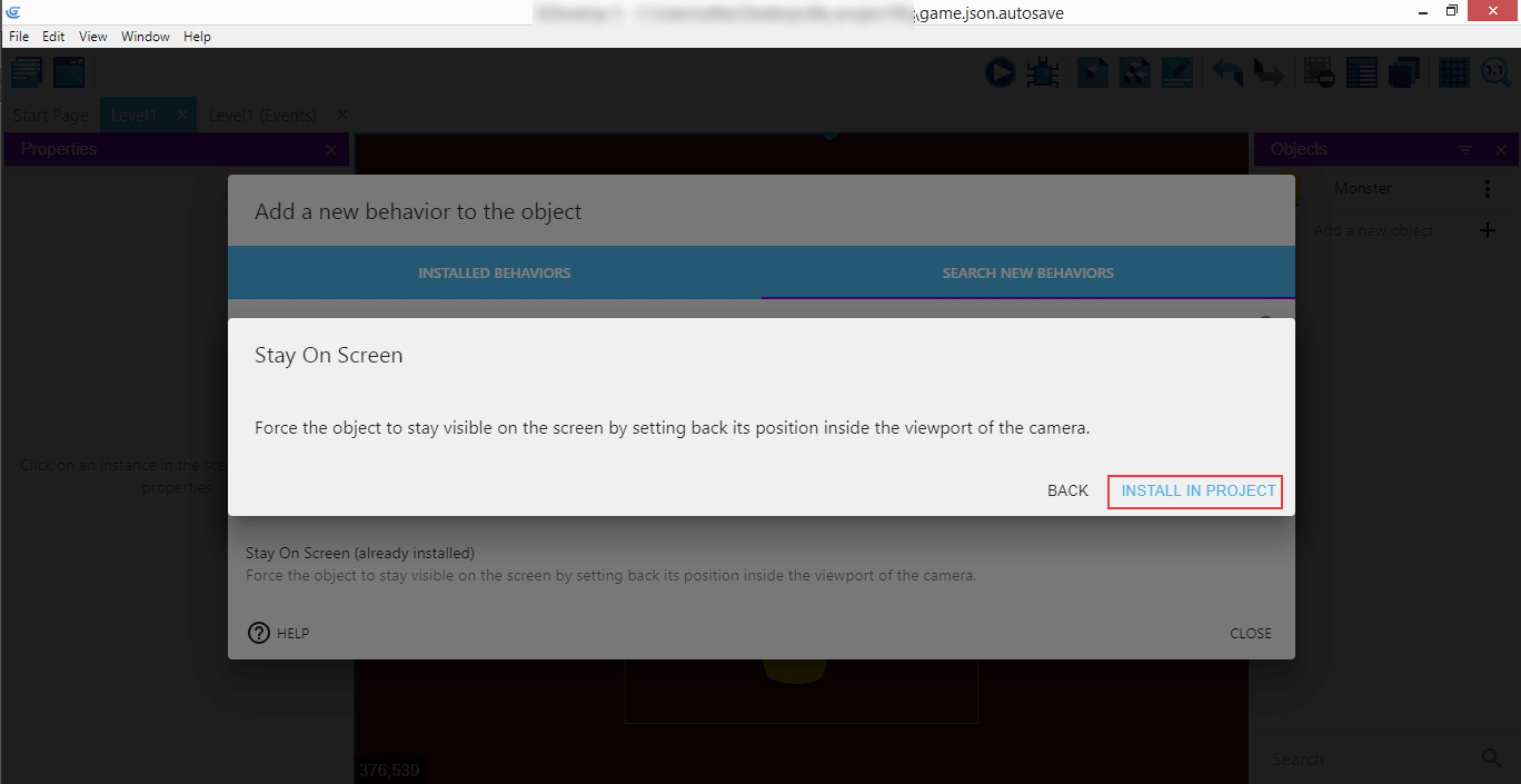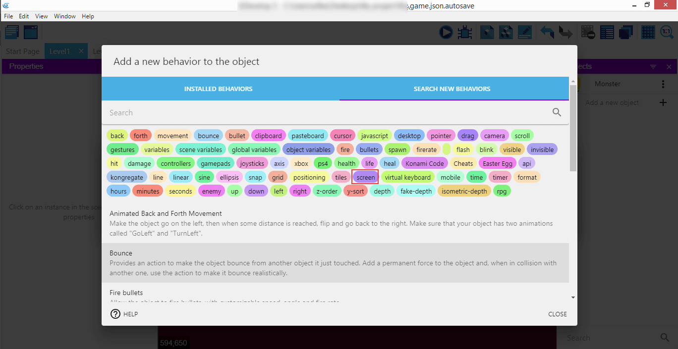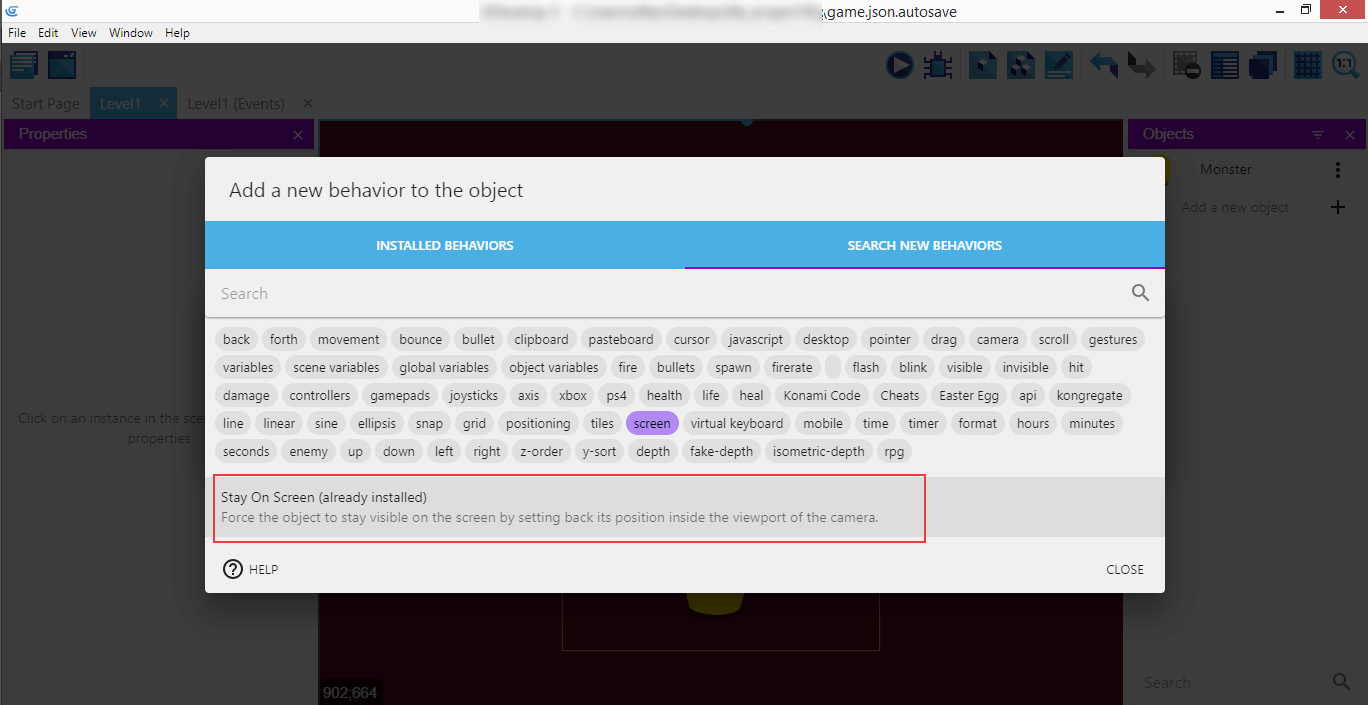 It's the "Stay On Screen" custom behaviors that we're going to use for the Monster.