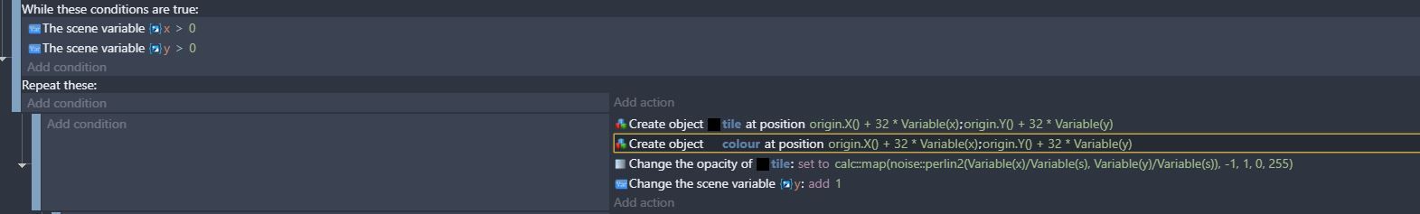 Back in the event sheets, goto the create tile event and copy the create tile action and paste it right below that. Then change the object to colour.