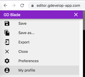 アカウントを持っていない場合は、無料で作成できます。[ファイル]メニュー(Windows および Linuxの場合)または GDevelop メニュー(macOS の場合)から[マイ プロファイル]を選択してください。
