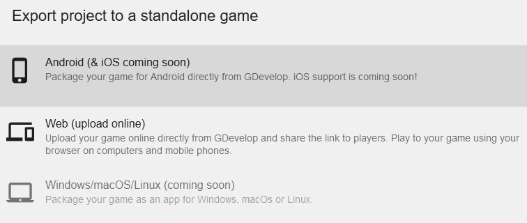 GDevelopを使用すると、AndroidやiOSを含むさまざまな形式でゲームを公開できます。ゲームをエクスポートするには、GDevelopインターフェースの上部にあるメニューから[ファイル]をクリックし選択します。任意のエクスポートオプションを選択します。この場合、 表示されるオプションのパネルからAndroidとiOSを選択します。
