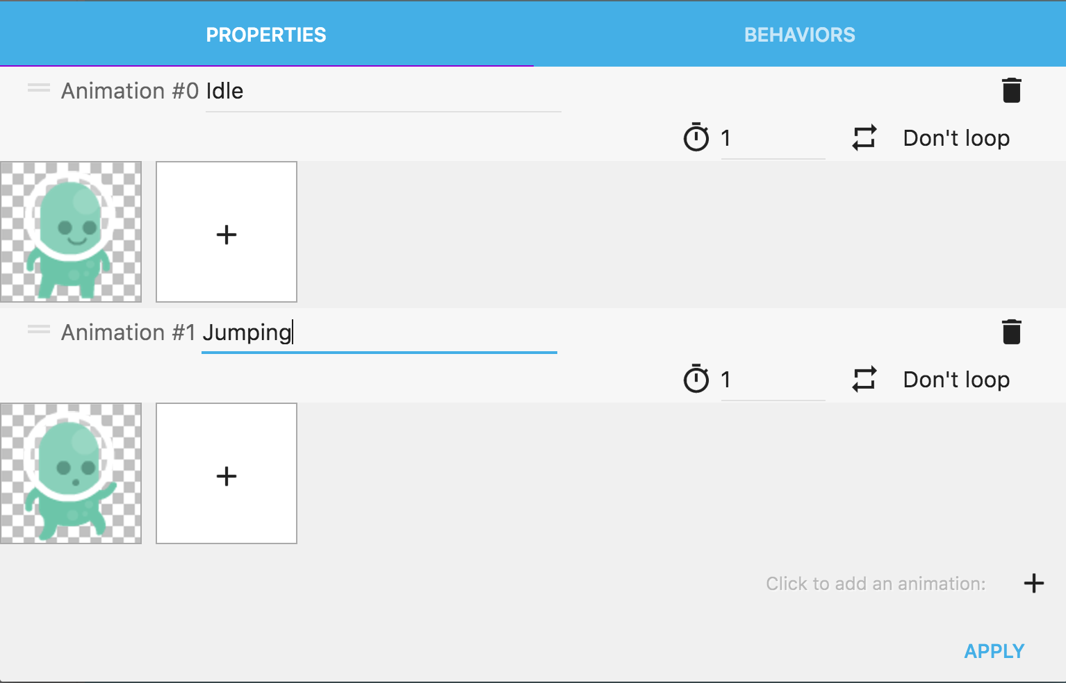 Playerオブジェクトのエディターを開き、プロパティータブ上にいることを確認してから、ウィンドウの下部にある「+」ボタンをクリックしてアニメーションを追加します。最後に、新しいアニメーションを追加する記号「+」が付いたサムネイルをクリックして、「p1_jump」を追加する画像として選択します。