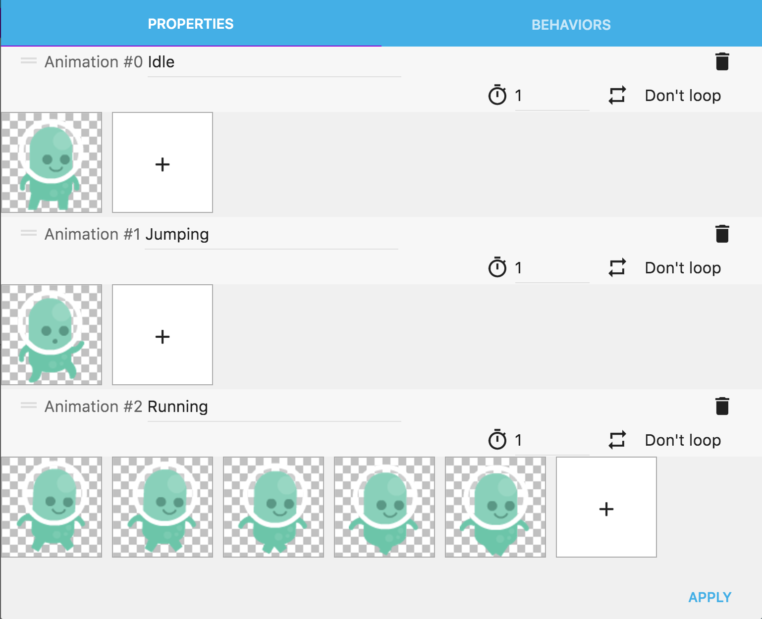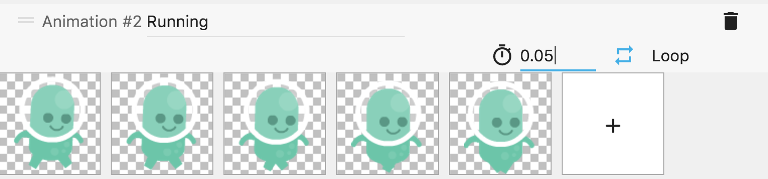 また、キャラクターがプラットフォームを歩いているときに表示する歩行アニメーションを追加する必要があります。画像を追加するとき、5枚の画像を選択し、前に行ったように、p1walk03.png、p1walk04.png...とp1_walk07.pngとして別のアニメーションを追加します。必要に応じて、すべての画像を一度に選択することも、1つずつ選択することもできます。最後に、アニメーションの名前を次の「ランニング」のように設定します。