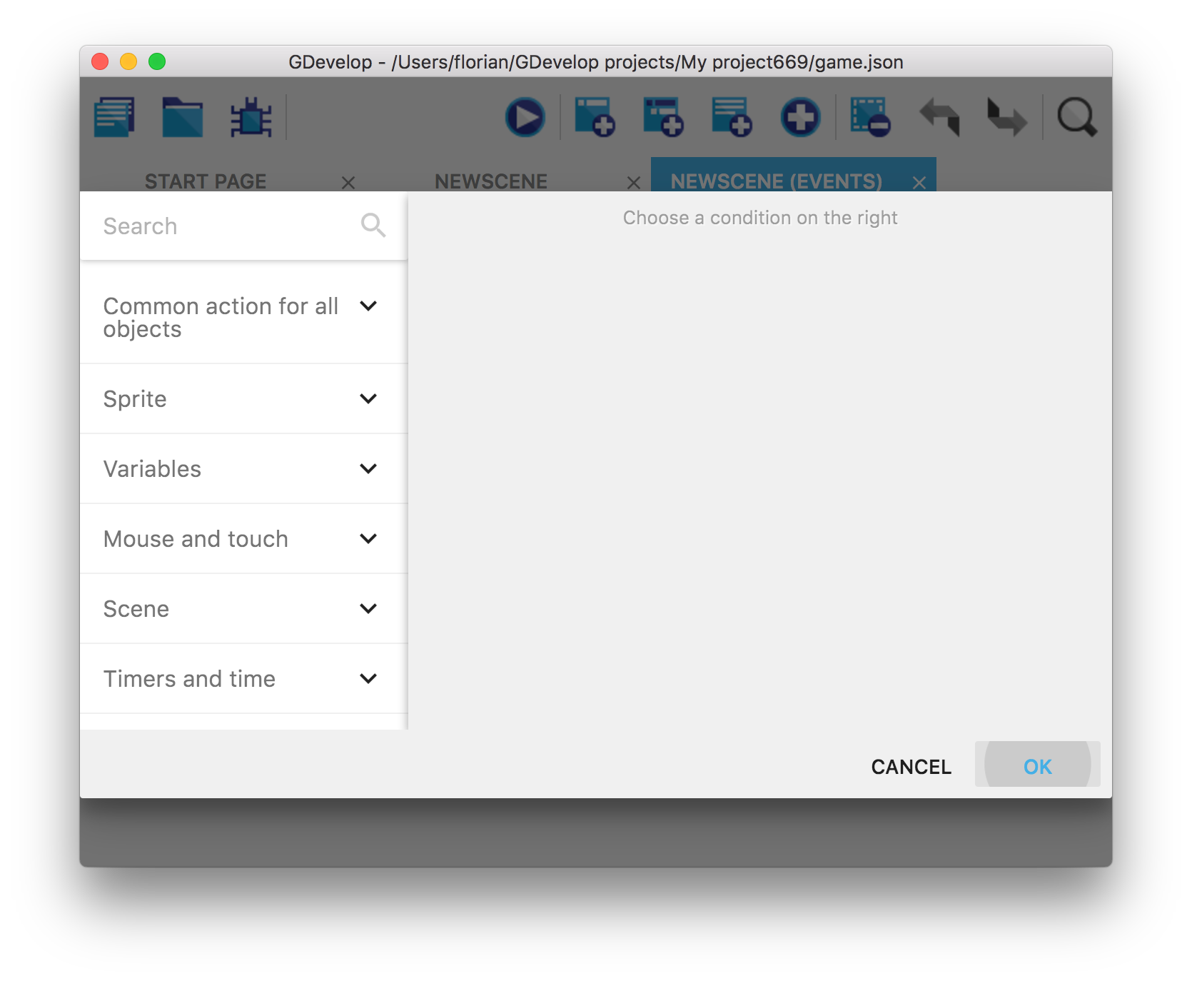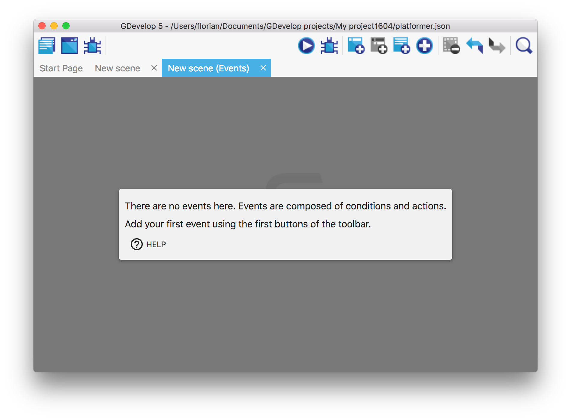 イベントは、条件のリスト(たとえば、衝突が発生しているかどうか、キーが押されたかどうか、プレーヤーの寿命が短いかどうかなど)と、条件が満たされたときに発生するアクションのリストで構成されます。