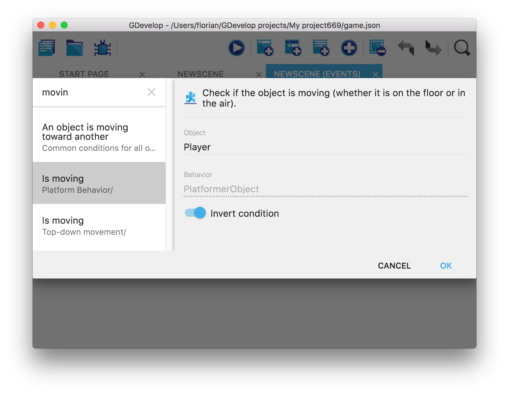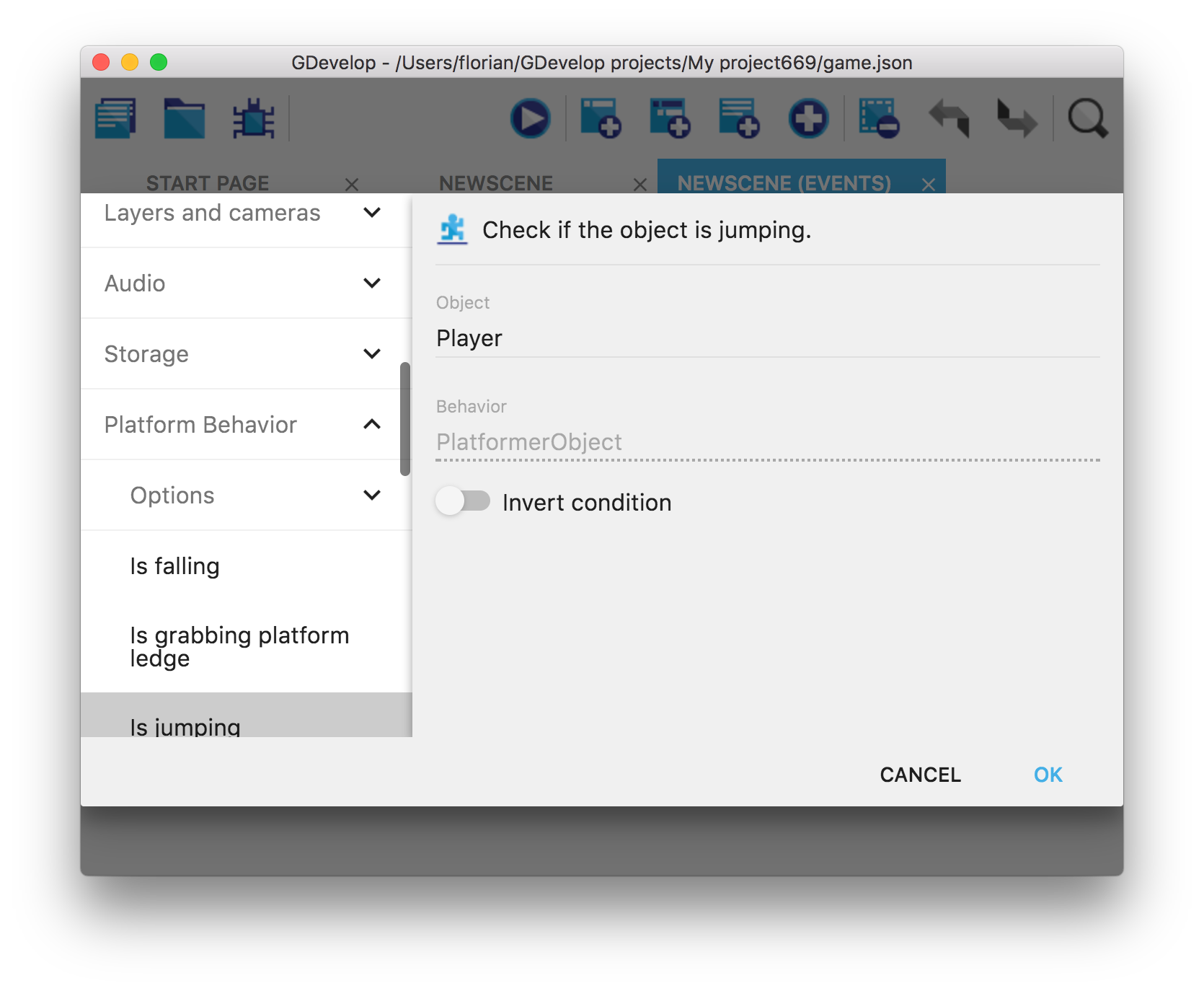 新しいウィンドウで、ゲームを作成するために利用可能なすべての条件を確認できます。キャラクターの動作を持つPlayerオブジェクトがジャンプしているかどうかを確認します。 Platformビヘイビアというカテゴリを開き、「ジャンプ中」を選択します。