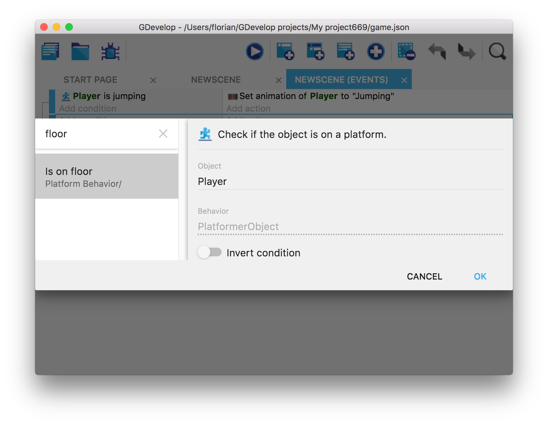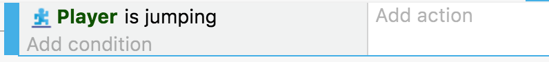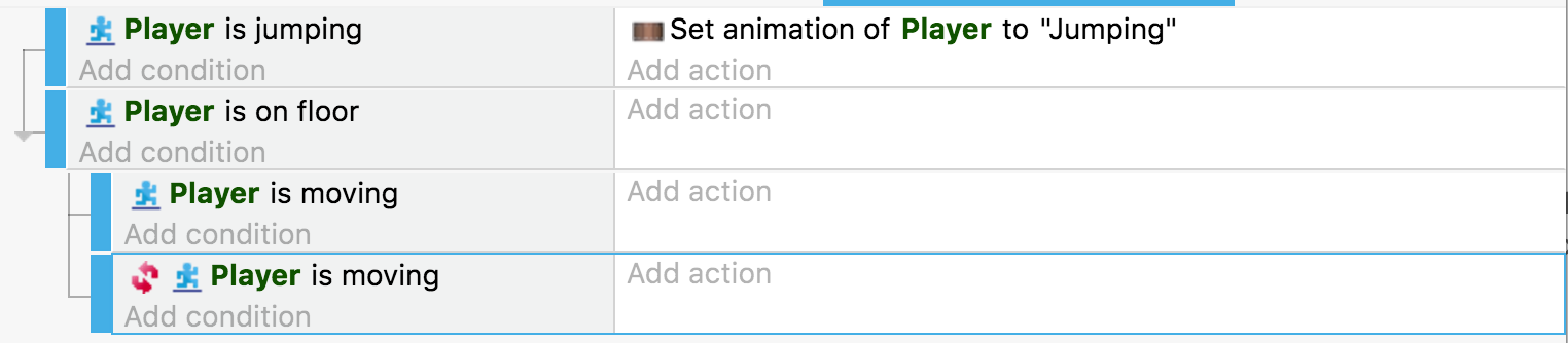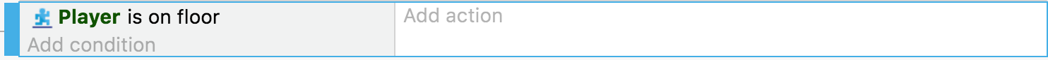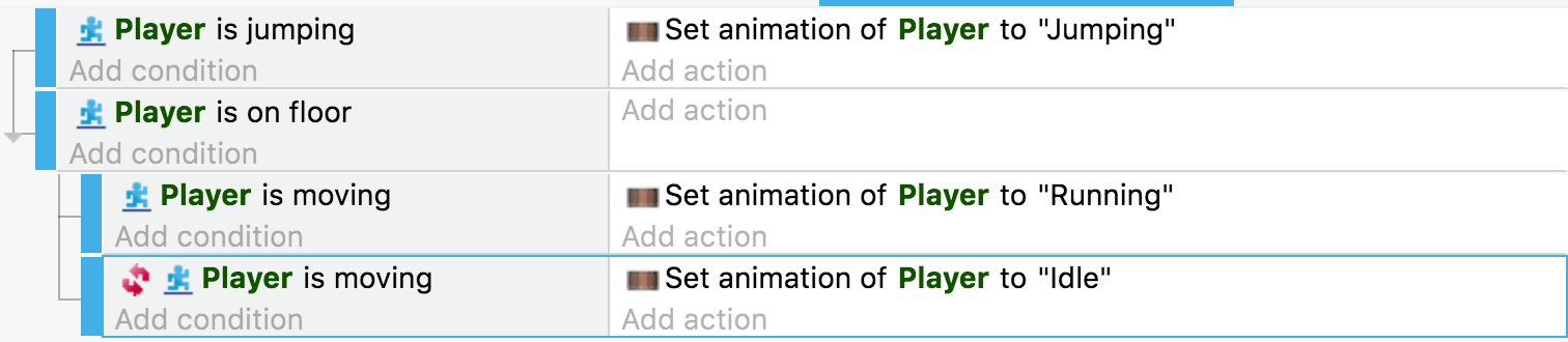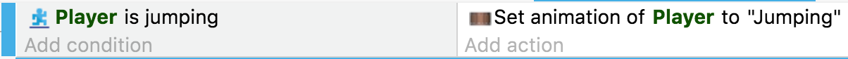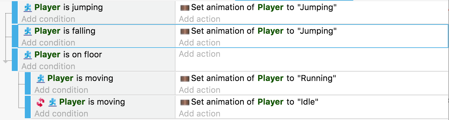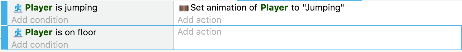 ただし、プレーヤーが地面に戻ったとき、アニメーションが停止アニメーションに戻されていないことがわかります。これは、単にGDevelopにそうするように指示したことがないためです!これを修正するために別のイベントを追加しましょう。
