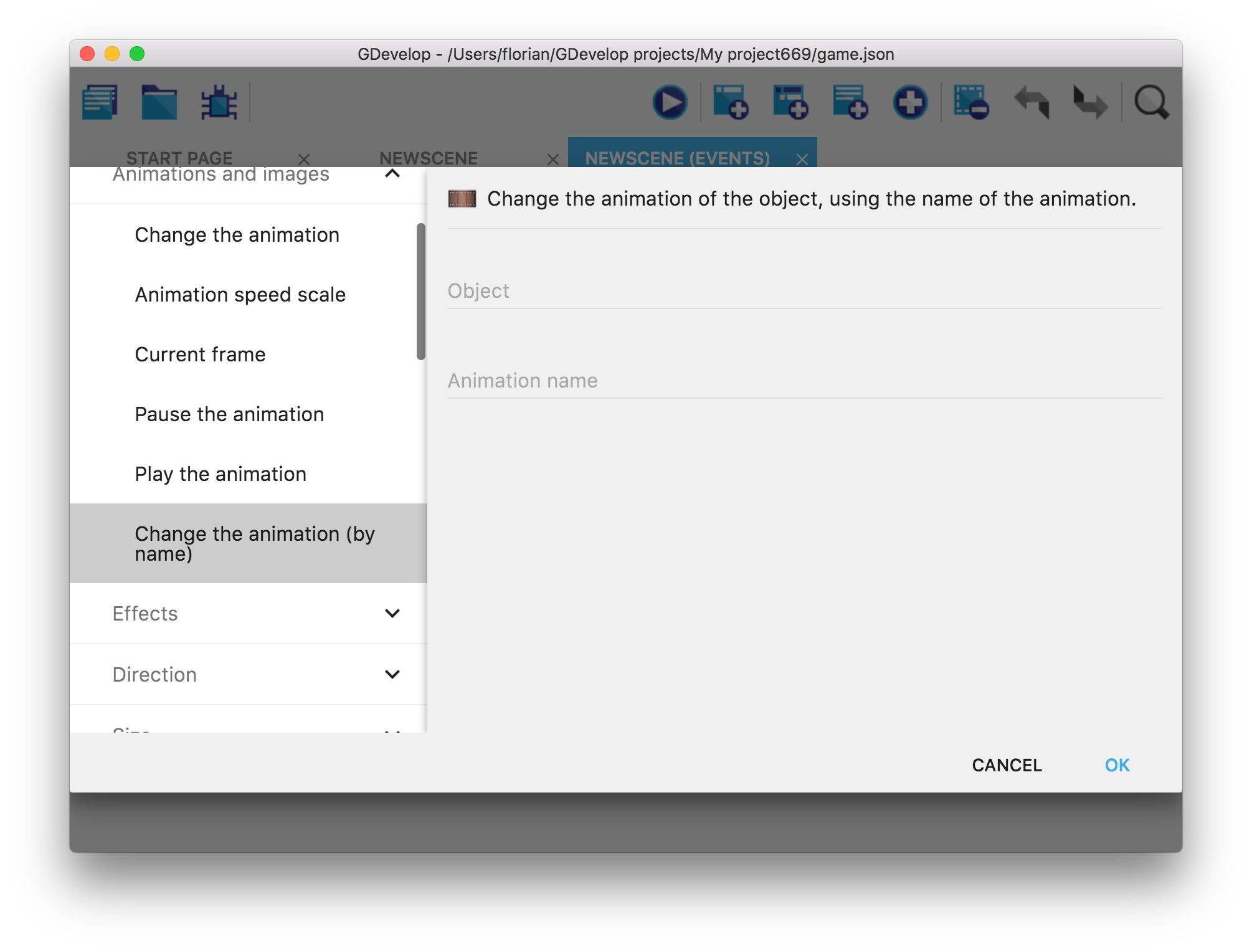 次に、プレーヤーが何をしているかに応じて、オブジェクトによって表示されるアニメーションを変更する必要があります。イベントを使用します。これらのイベントは、ゲームのルール、オブジェクトのアニメーション化、移動、プレイヤー入力への応答方法を記述するために使用されます。これは、非常に迅速に学習でき、すべての人がアクセスできる視覚的プログラミングの一種です。