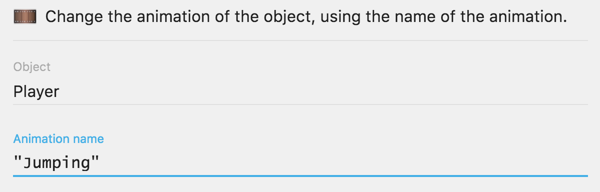 Player最初のパラメーターのオブジェクトで「ジャンプ中」を 選択し、2番目のフィールドに書き込みます。注意してください、あなたはGDevelopアクションや条件のいずれかのテキストは、式を使用することができるように二重引用符を記述する必要があります。これがテキストであることをGDevelopを伝えるために、二重引用符を使用する必要があります。