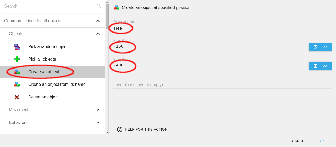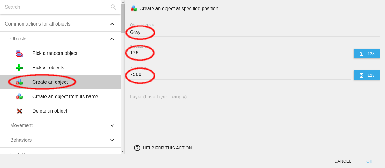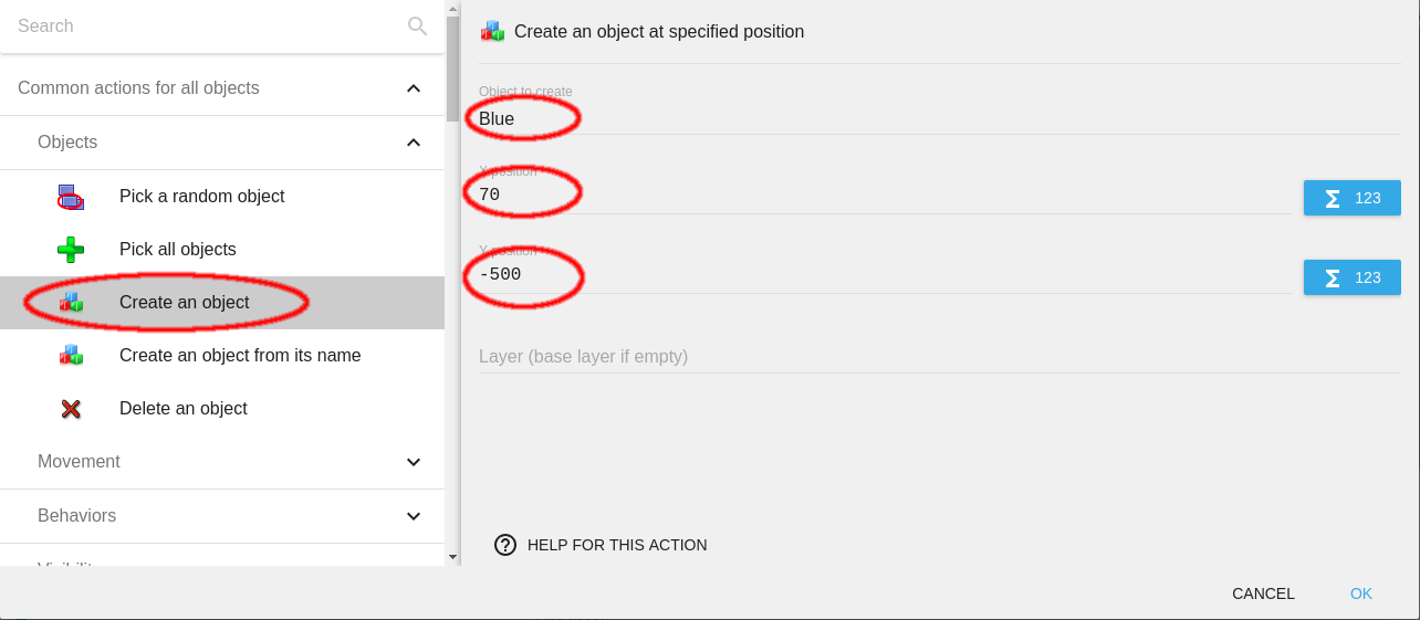In case of this condition being true, we need to create an object Explosion. You can use the action Create an object and fill Explosion in the Object to create field.