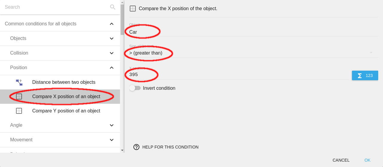 Similarly, we need to add another event, with the condition to check if the X position of the Car is more than 395 px.
