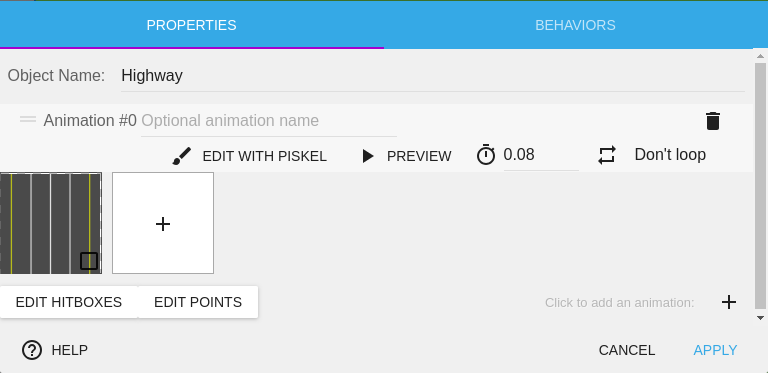 同様に、アニメーションとして画像「highway.png」で構成される、新しいスプライトオブジェクト_Highway_を追加します。
