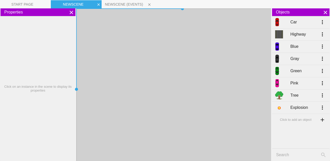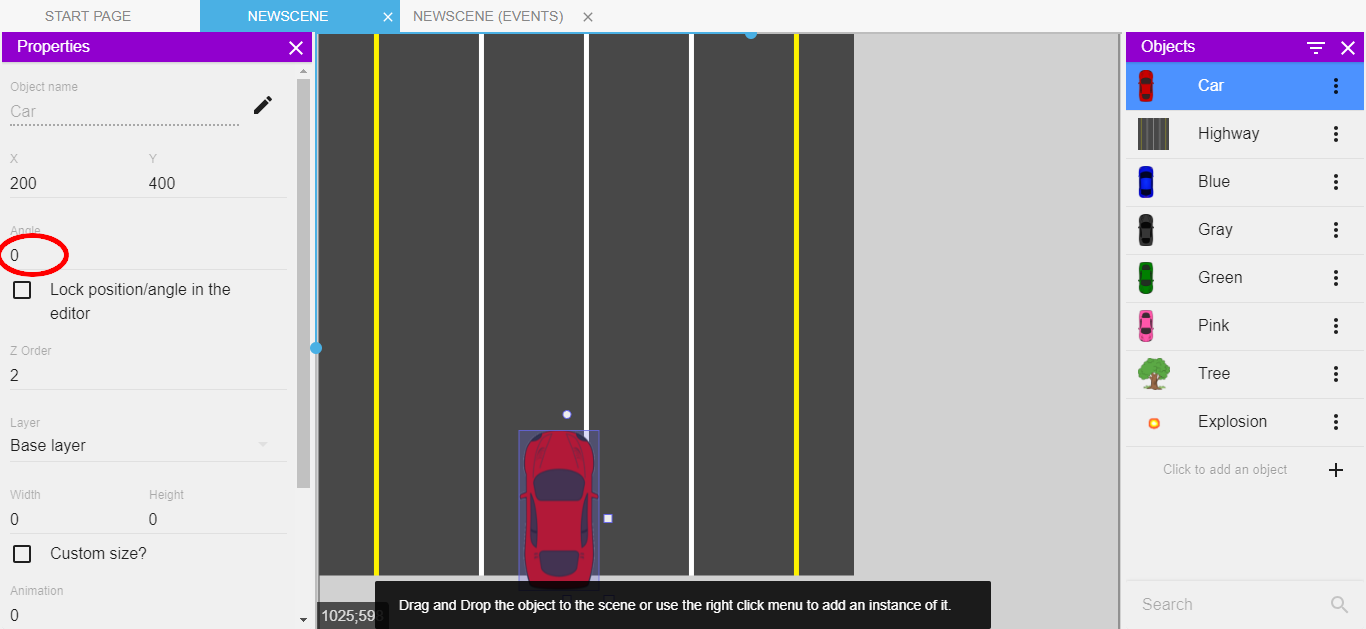 Similarly, to create an instance of Highway you can drag and drop the object to the scene and set its X and Y-coordinates.
