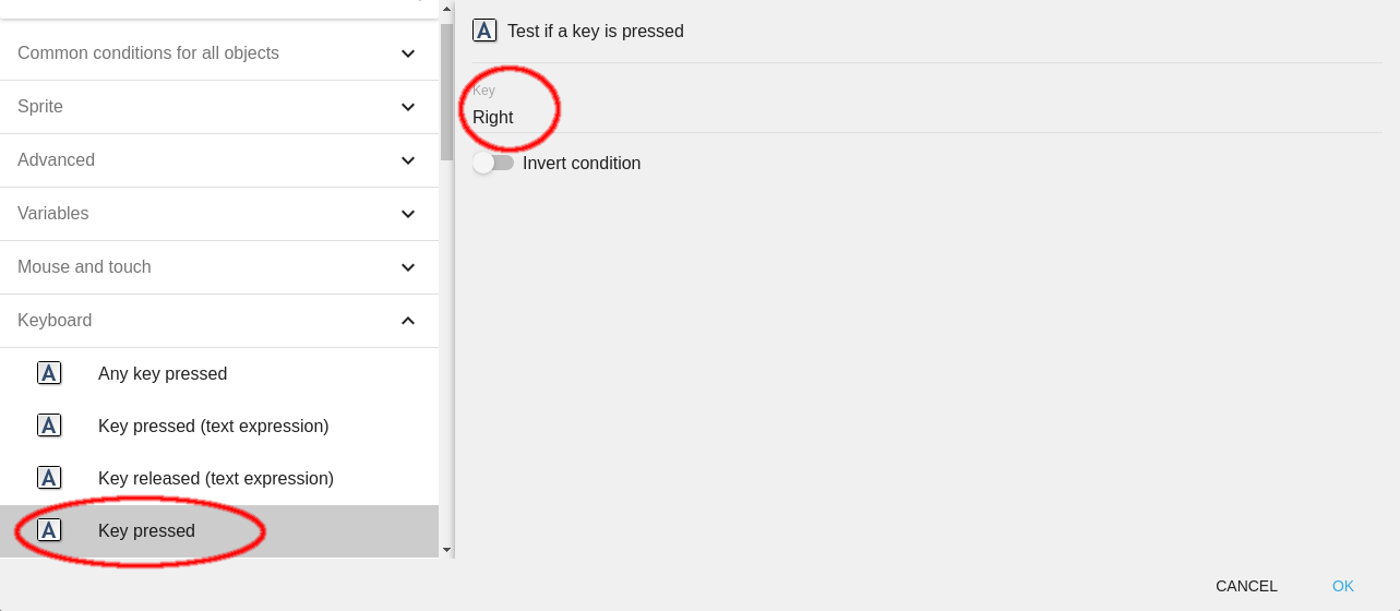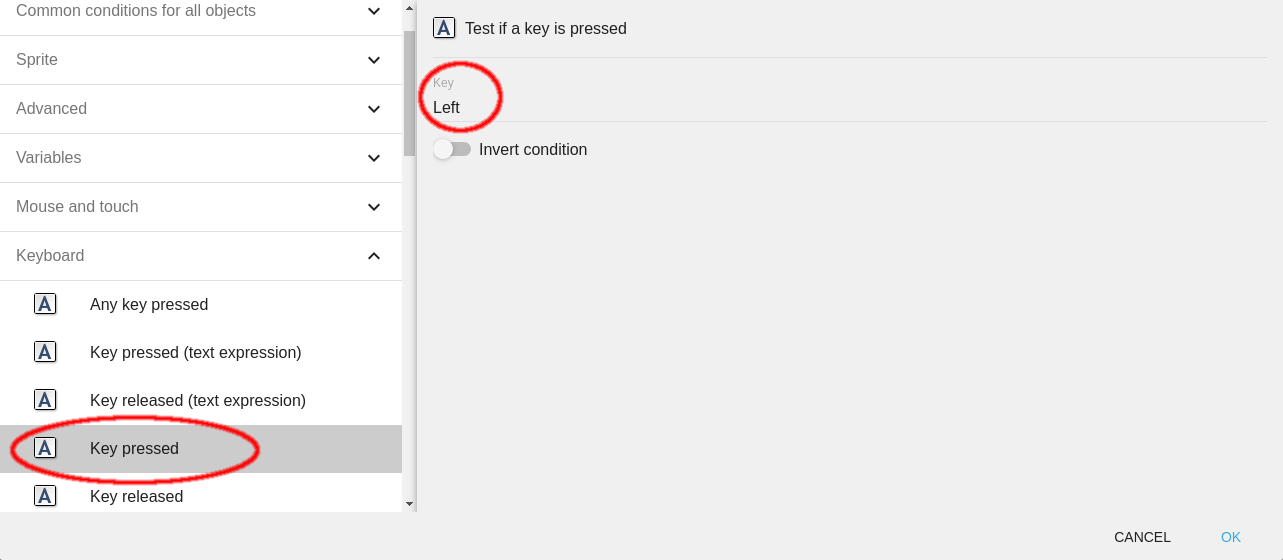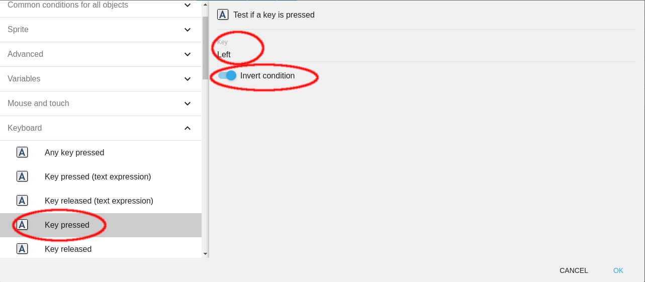 To achieve this, we add a new event and try to add the above 2 conditions, i.e. right key press inverted and left key press inverted. We add a condition Left key is pressed and turn on the switch below that says Invert conditions.