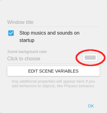 The gray background does not really suit the game. As there will be trees on both sides of the road, the green color might be the best. To do so, you can right-click anywhere on the scene and select Scene properties. Click on the box below Scene background color that says Click to choose.