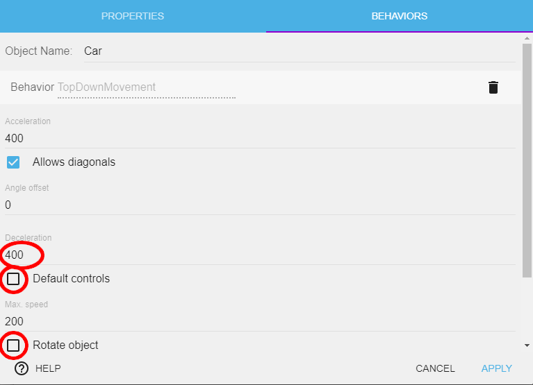 This opens a wide variety of options to alter. You can see the default values for the related to the behavior. Set the deceleration to 400 and untick the boxes having the options Rotate object and Default controls and click APPLY. Rest of the default values are fine for our game.