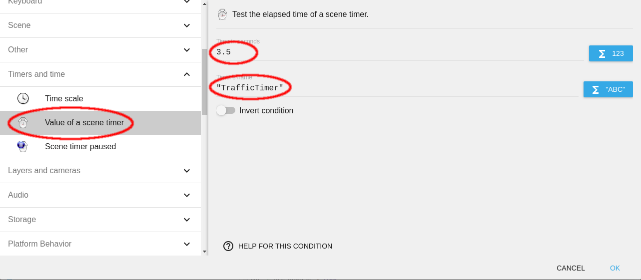 To display the score, we will make an event such that when any object in the group Traffic passes a predefined position, the value of the score is updated. To do this, we need to use the help of a scene variable.