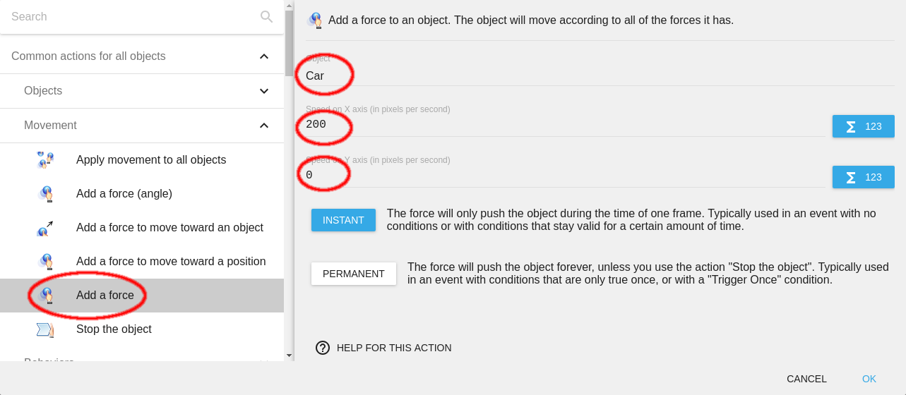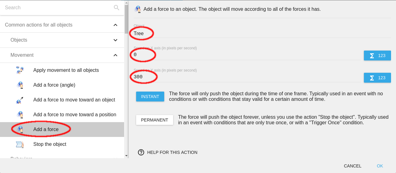 Add the action Add a force to the Tree. The movement of the car should be in the vertical direction only. There should not be a horizontal component of the force applied to it. So the speed on the X axis should be set to 0 and the speed on the Y axis will be set to 300 pixels/second.