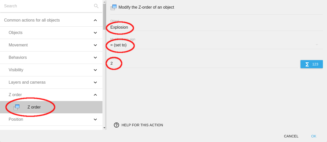 - To make the Explosion visible, add an event to set the Z Order of the object Explosion so that it is higher than that of the Highway