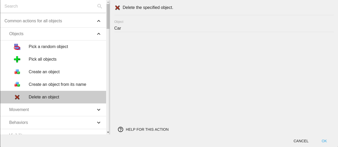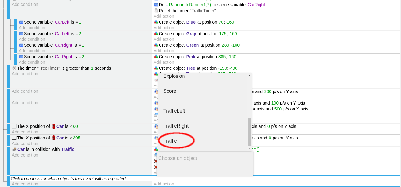To solve this problem as well as to optimise the game by freeing up memory, we will add another action to the event which will delete the object Traffic.