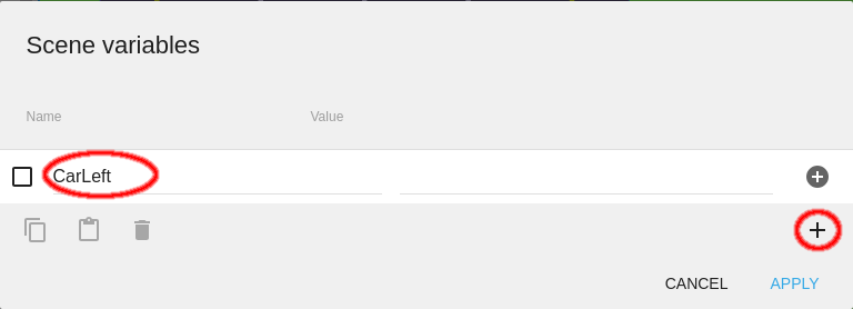 Our action will be to create and change the value of a scene variable. Create a new scene variable Points similar to how we created variables CarLeft and CarRight.