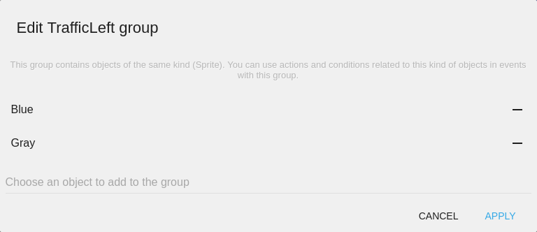 Click on the Choose an object to add to the group field and choose the object Blue followed by Gray and click APPLY. This object group represents the cars on the left side of the highway.
