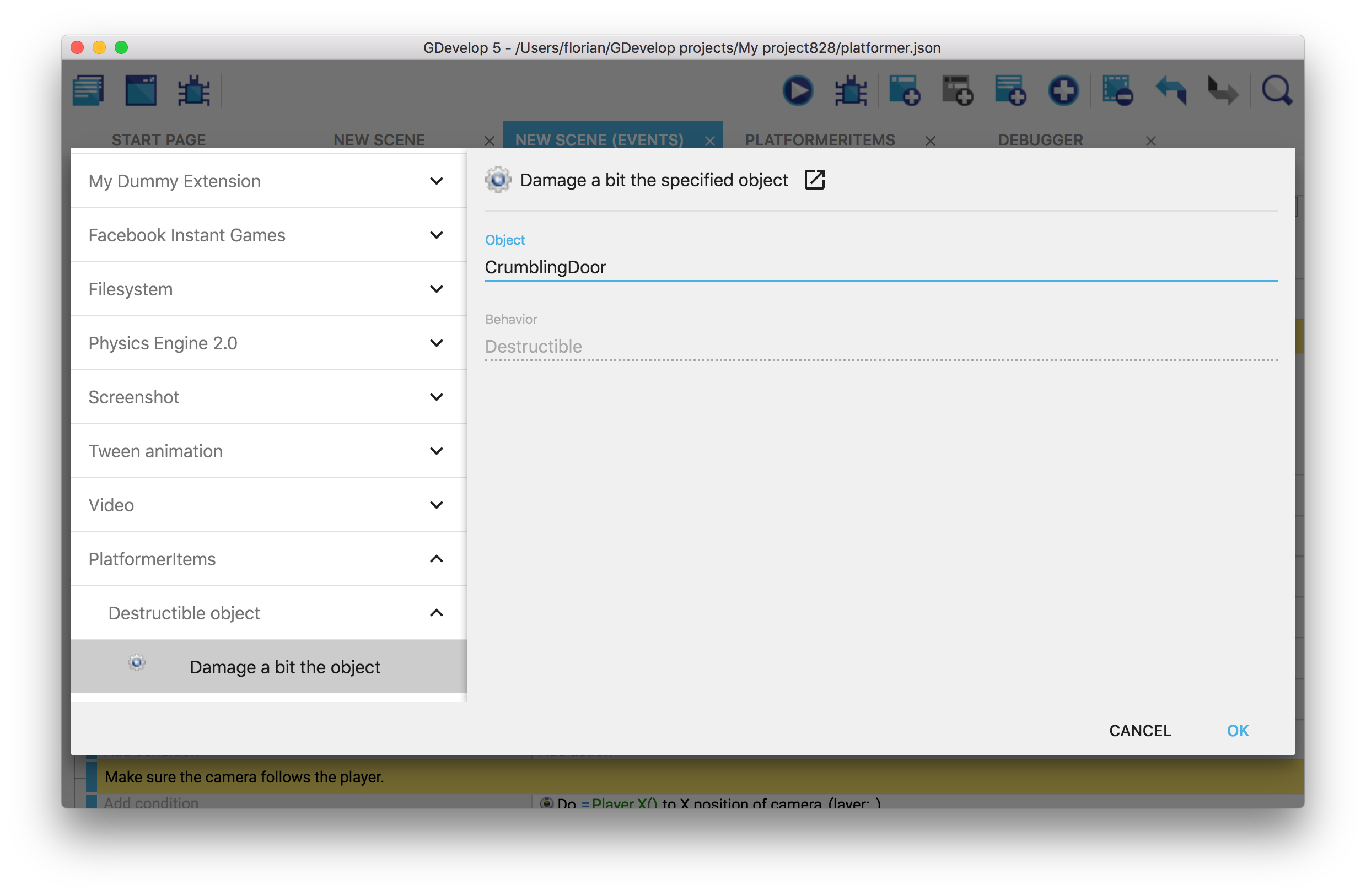 Here, you can see the "Destructible Object" behavior for example (that was created in the previous screenshots):